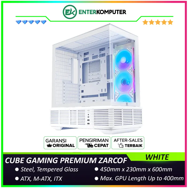 CUBE GAMING PREMIUM ZARCOF WHITE - ATX Gaming Case - Panoramic View - All White Inside - BTF Mainboard Ready - Front & Left Side Tempered Glass with Tools Free - USB Type C Ready - PSU Cover - Free 3Pcs 120mm Reverse Infinity Mirror Auto-RGB Fan