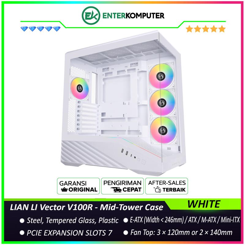 lian li vector v100r white mid tower case 270 seamless visibility with argb lighting strip back connect motherboards compatible 4mm tempered glass usb type c free 3pcs 120mm reverse argb fan 1pcs 120mm argb fan