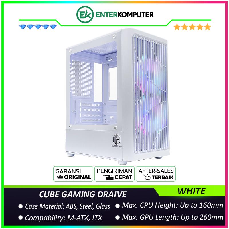 cube gaming draive white matx gaming case all white inside front mesh left side tempered glass psu cover dust filter free 2pcs 12cm argb fan
