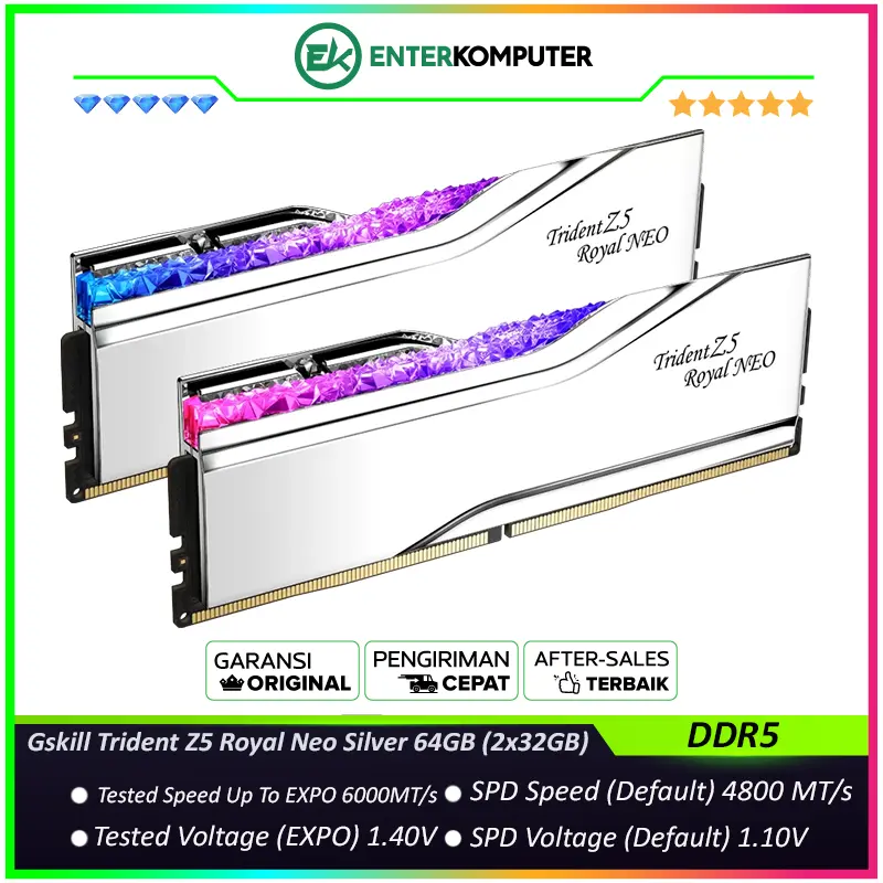 Gskill Trident Z5 Royal Neo Silver DDR5 PC48000 6000MHz 64GB (2x32GB) 30-36-36-96 - F5-6000J3036G32GX2-TR5NS