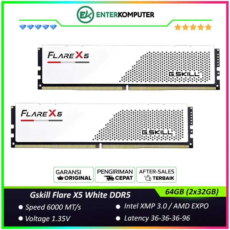 Gskill Flare X5 White DDR5 PC48000 6000MHz 64GB (2x32GB) 36-36-36-96 - F5-6000J3636F32GX2-FX5W